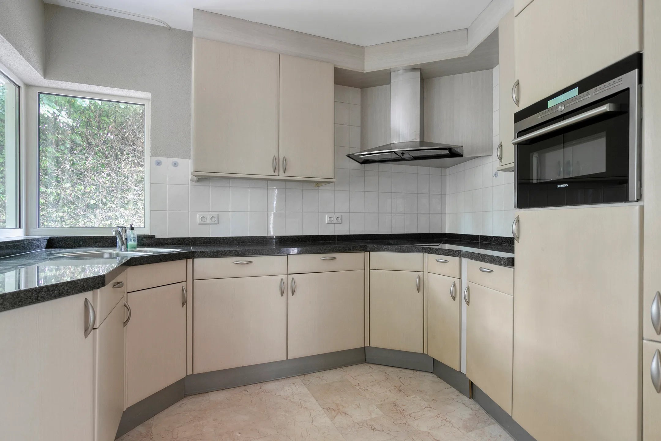 De keuken is opgesteld in een praktische U-vorm en uitgerust met moderne inbouwapparatuur. Vanuit hier kijkt u uit over de oprijlaan.